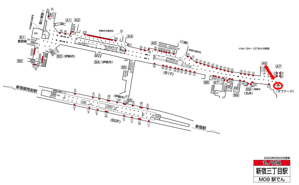 地下鉄丸ノ内線の新宿三丁目駅、新宿駅西口方面の地下通路A7出口正面に設置されている看板です。
