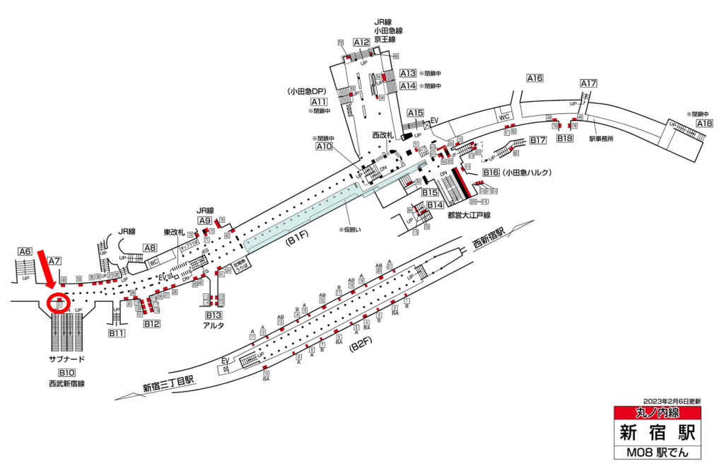 東京メトロ新宿駅は一日の乗降客数が227,366人、丸ノ内線が発着する駅です。