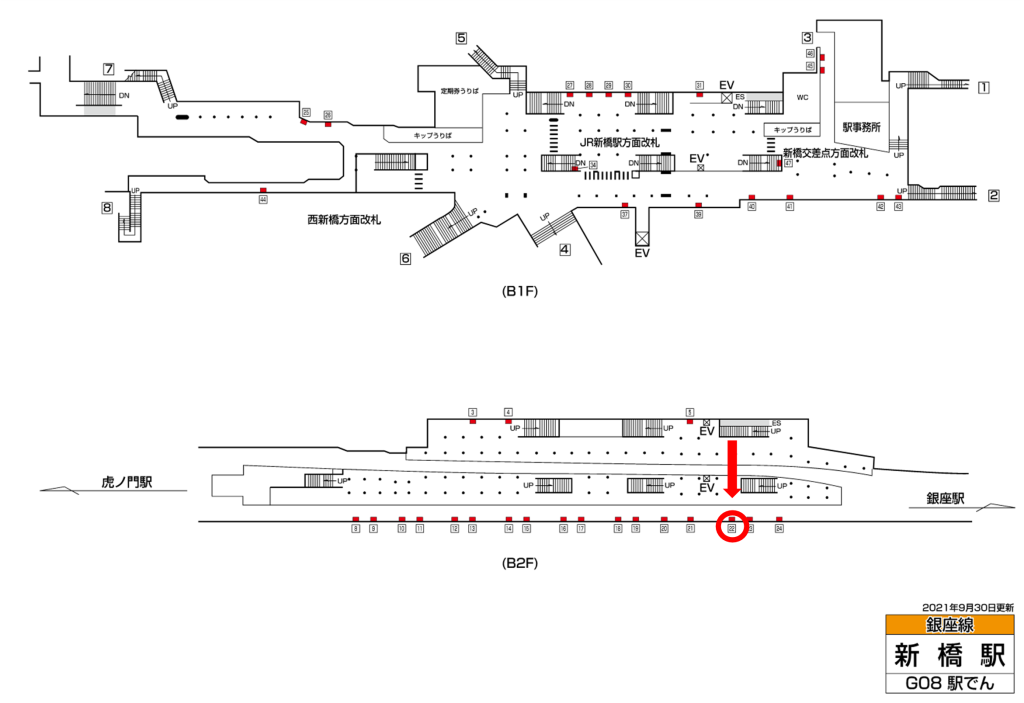 東京メトロ新橋駅は一日の乗降客数が215,520人、銀座線が発着する駅です。