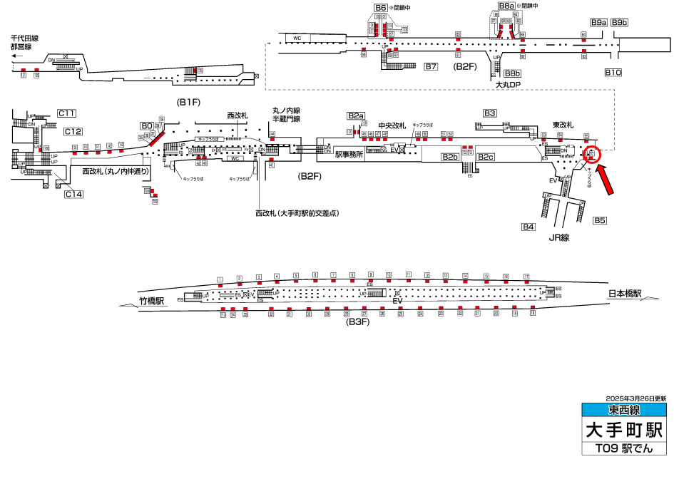 東京メトロ大手町駅は一日の乗降客数が288,037人、丸ノ内線・東西線・千代田線・半蔵門線が発着する駅です。