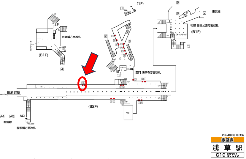 東京メトロ浅草駅は一日の乗降客数が103,019人、銀座線が発着する駅です。