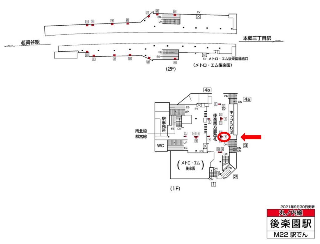 東京メトロ後楽園駅は一日の乗降客数が97,348人、丸ノ内線・南北線が発着する駅です。