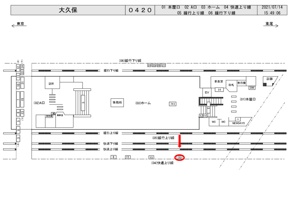JR大久保駅の新宿方面ホーム前快速上り線側、北口改札行きエスカレーター付近に設置された看板です。
