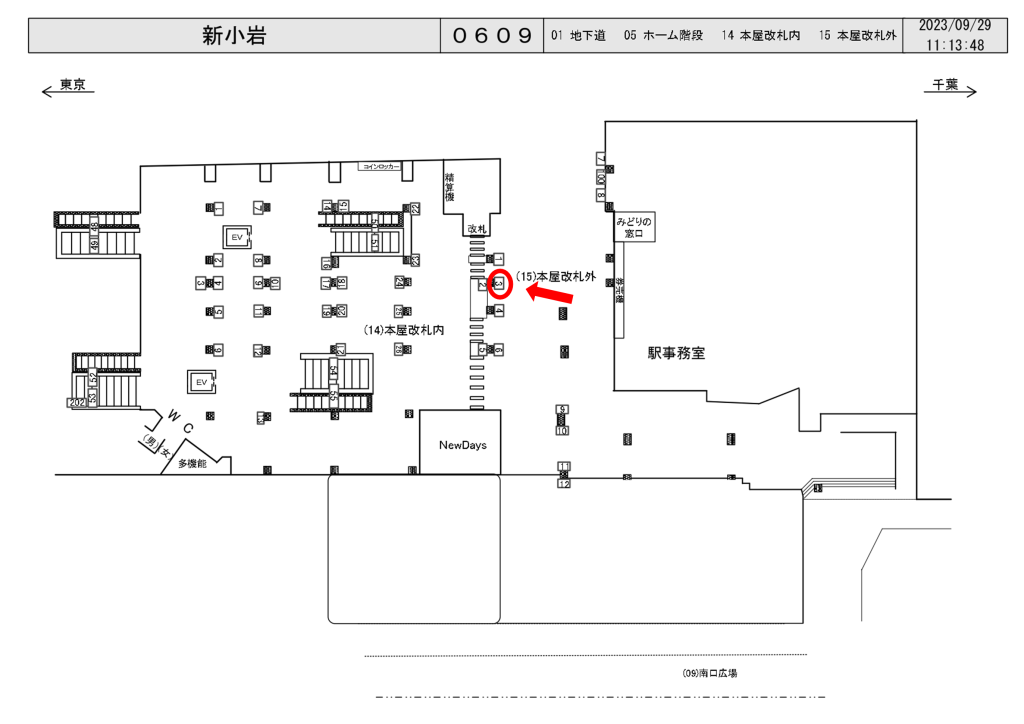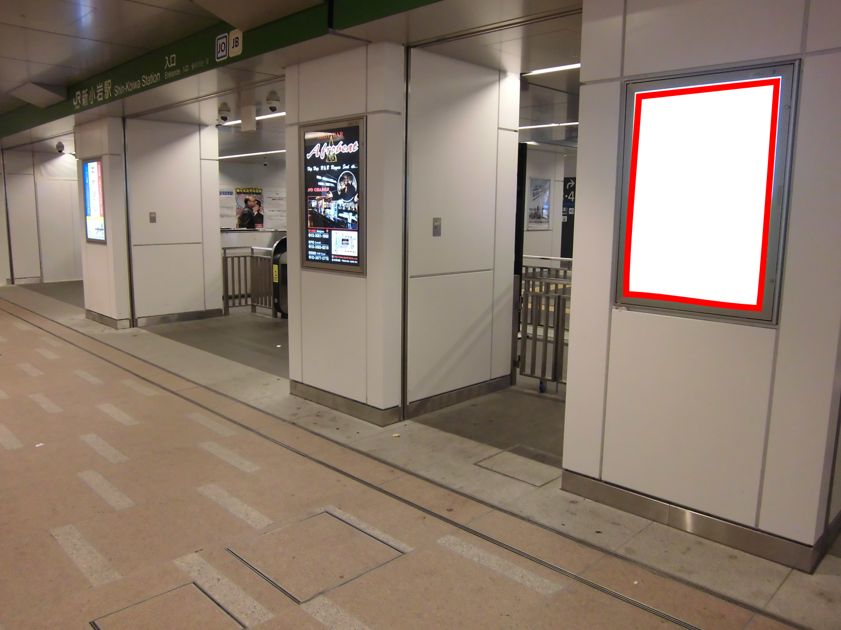 JR新小岩駅改札外の改札前の柱面に設置されている電飾看板です。