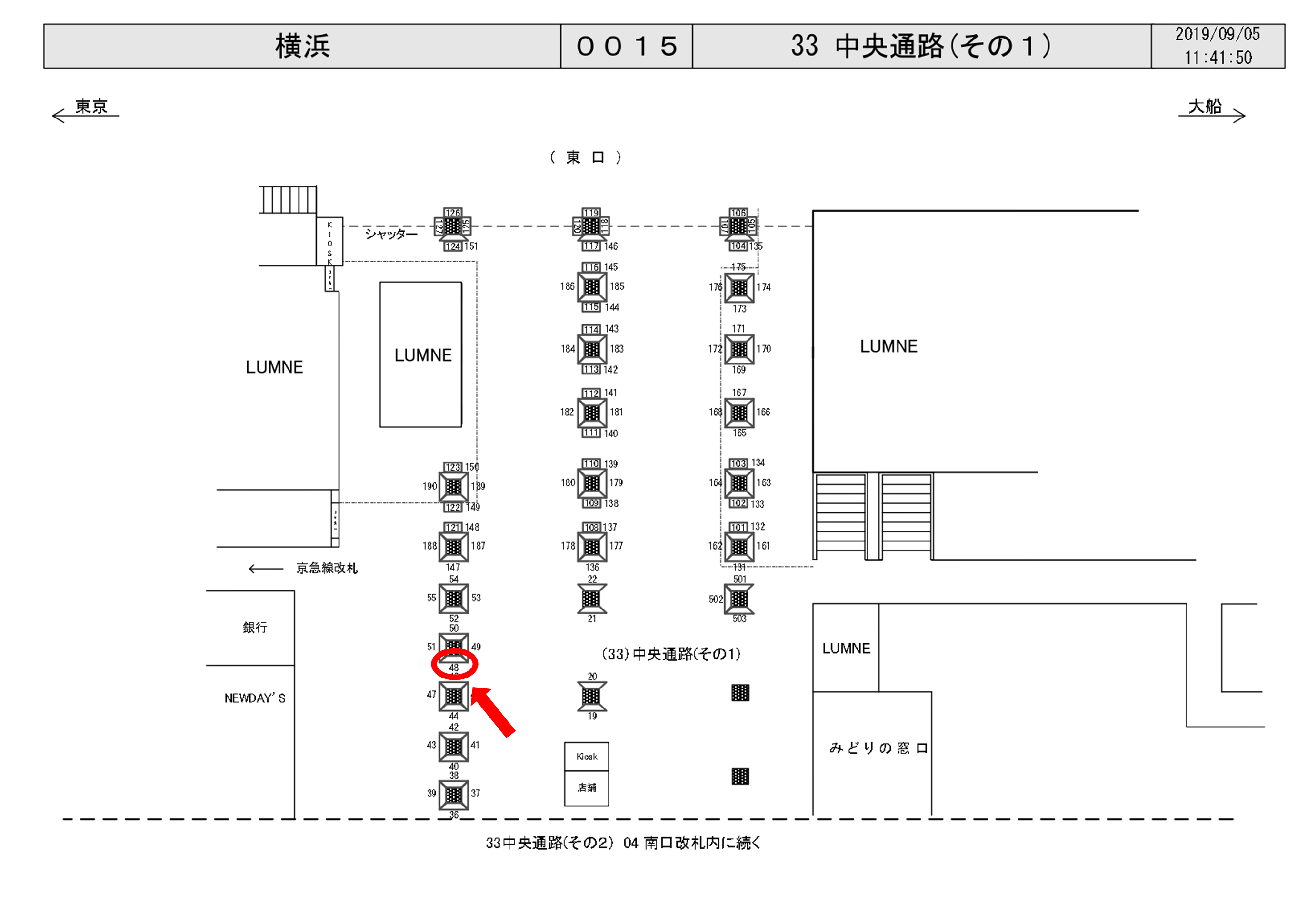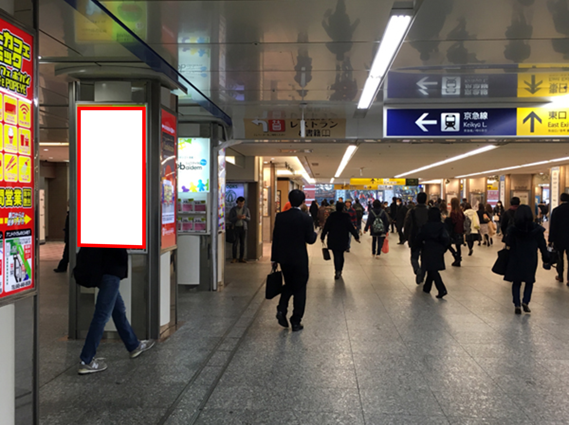 JR横浜駅の改札外、中央通路の柱面、銀行前の京急線改札入口付近の柱面に設置されている看板です。