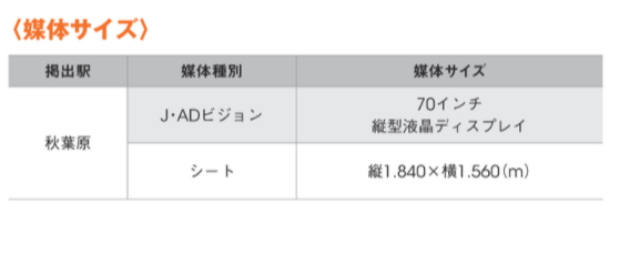 種類 J・ADビジョン、電照シート サイズ 媒体サイズは下記参照ください。