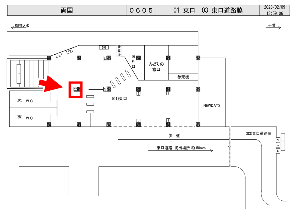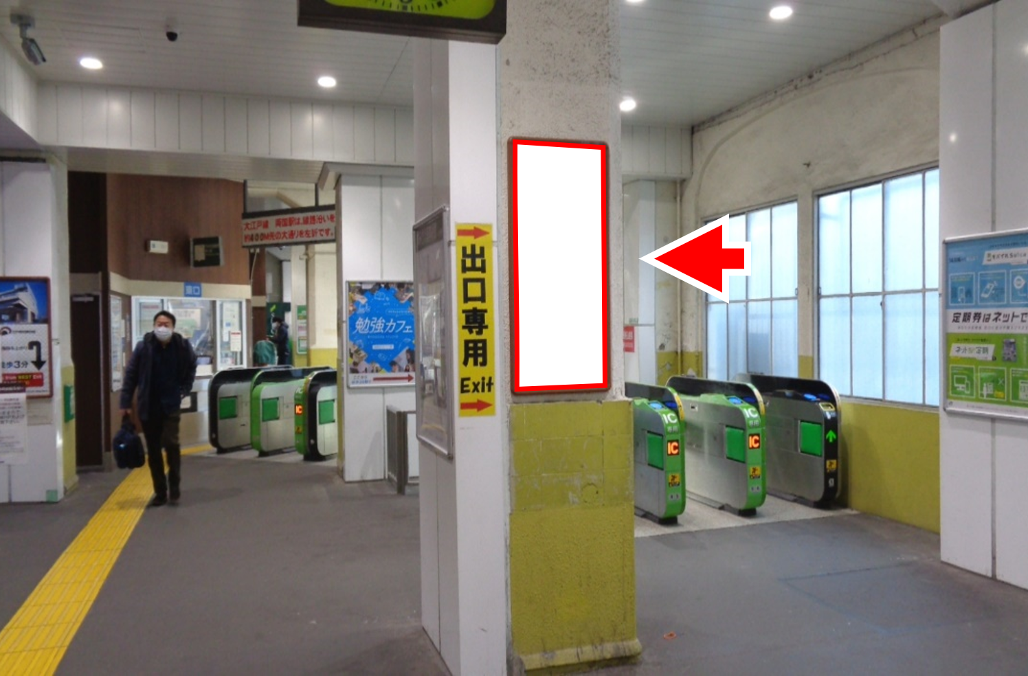 JR両国駅東口改札内、改札前の柱面に設置されている看板です。