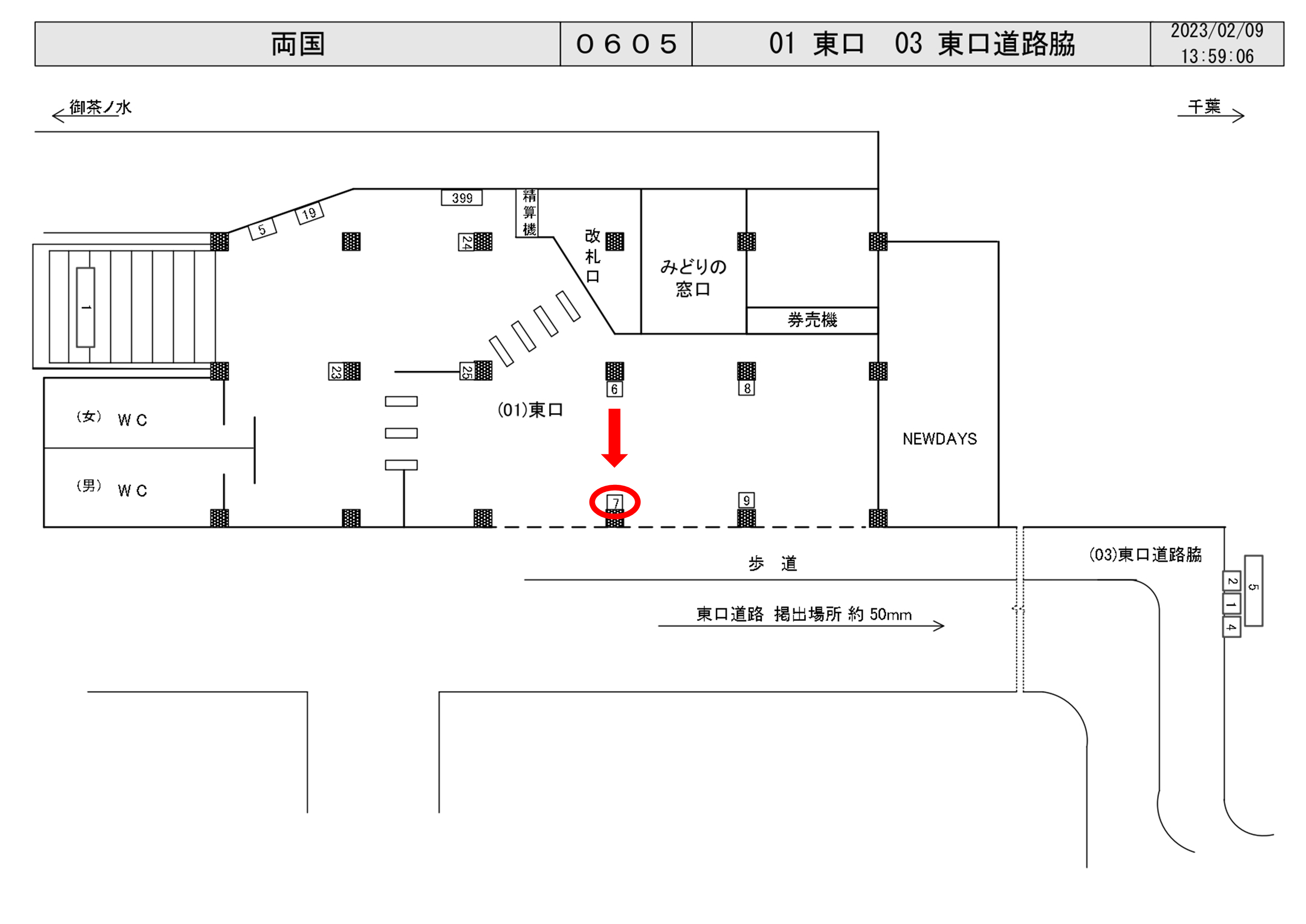 JR両国駅東口改札外、改札前の柱面に設置されている新設の看板です。