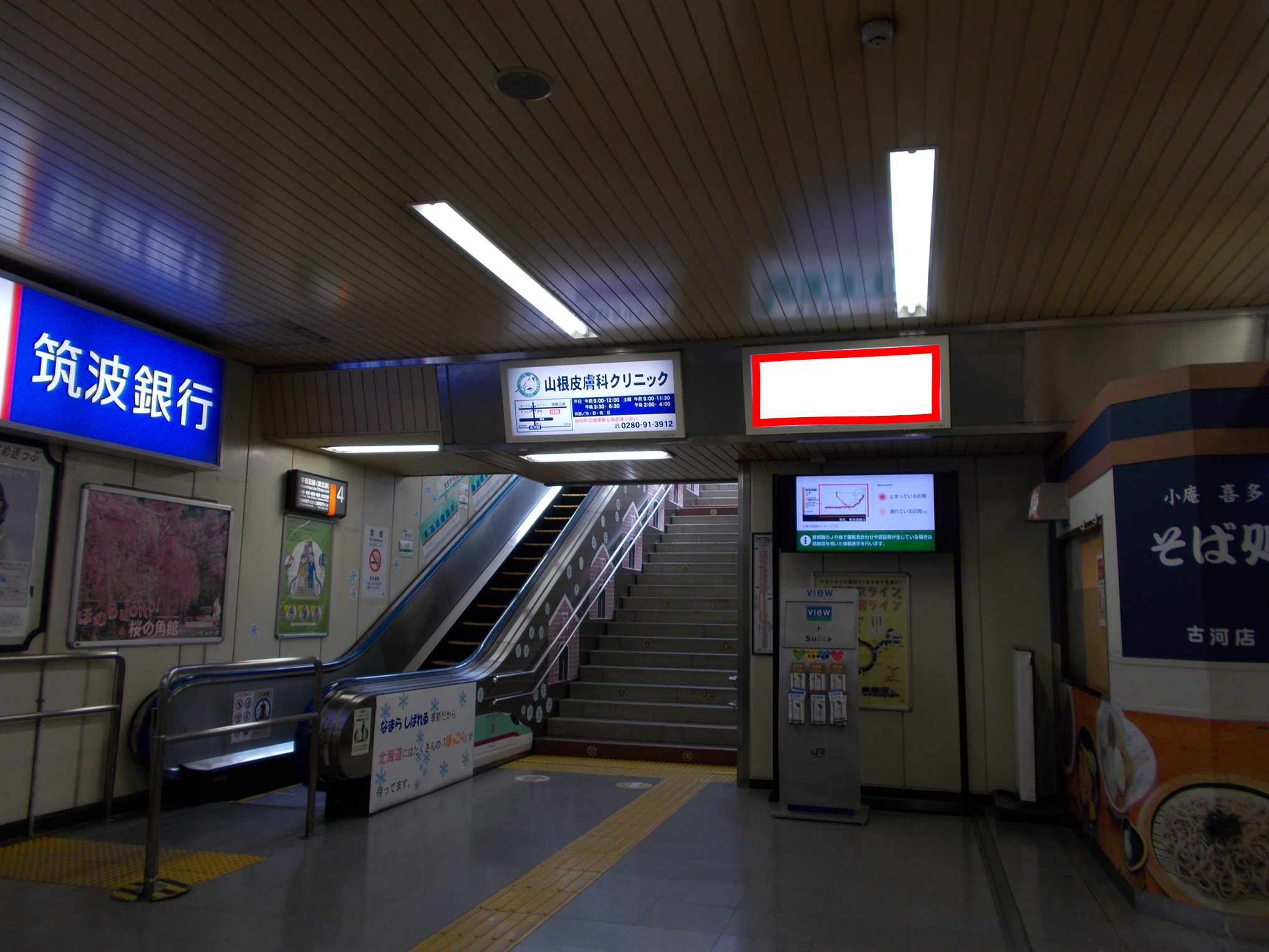 JR古河駅の改札内通路、ホーム階段下、上部に設置されている看板です。