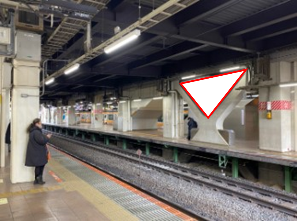 JR国分寺駅の中央線(立川・八王子・高尾方面)ホームに設置された逆三角形の大型看板です。