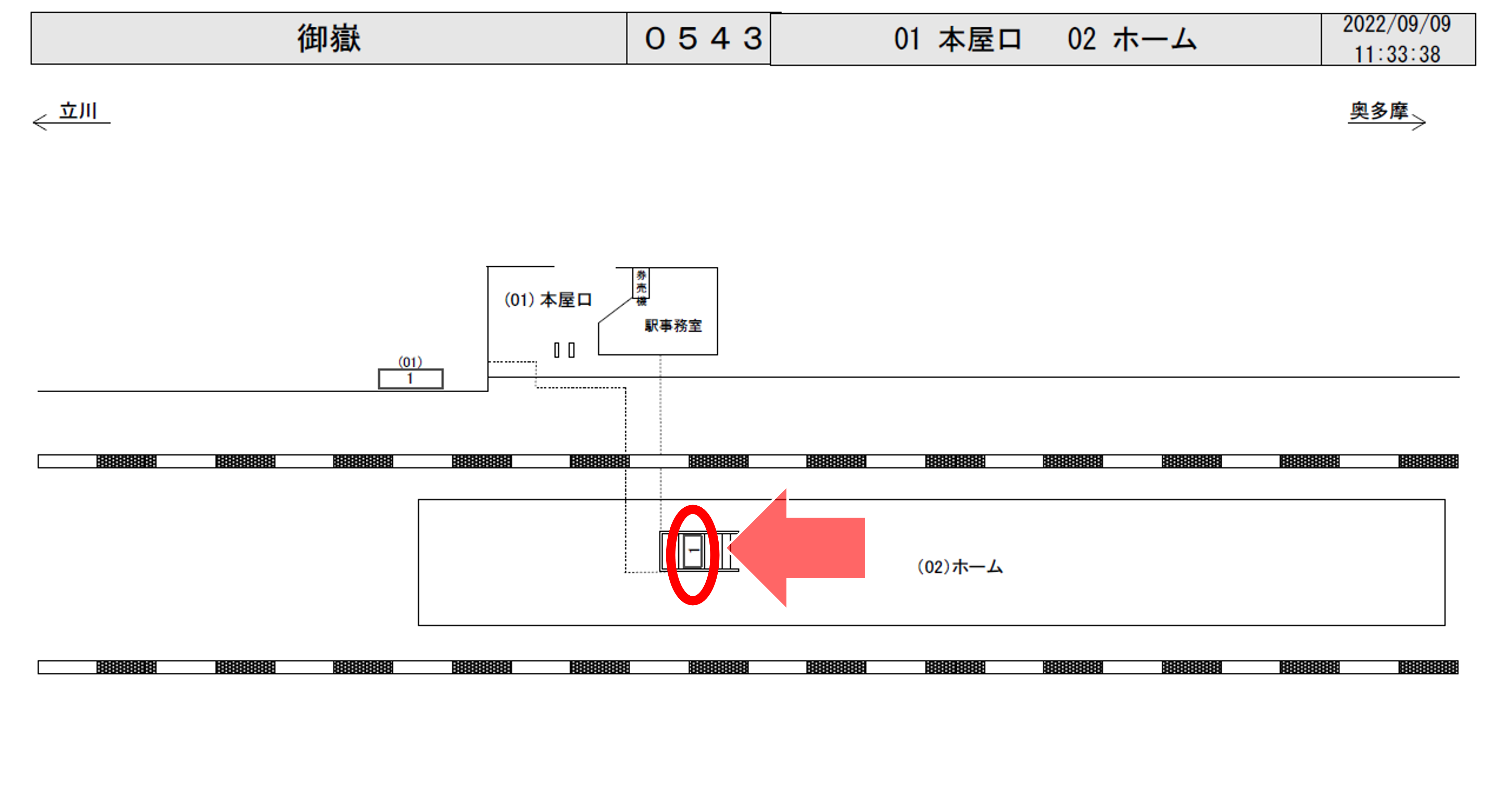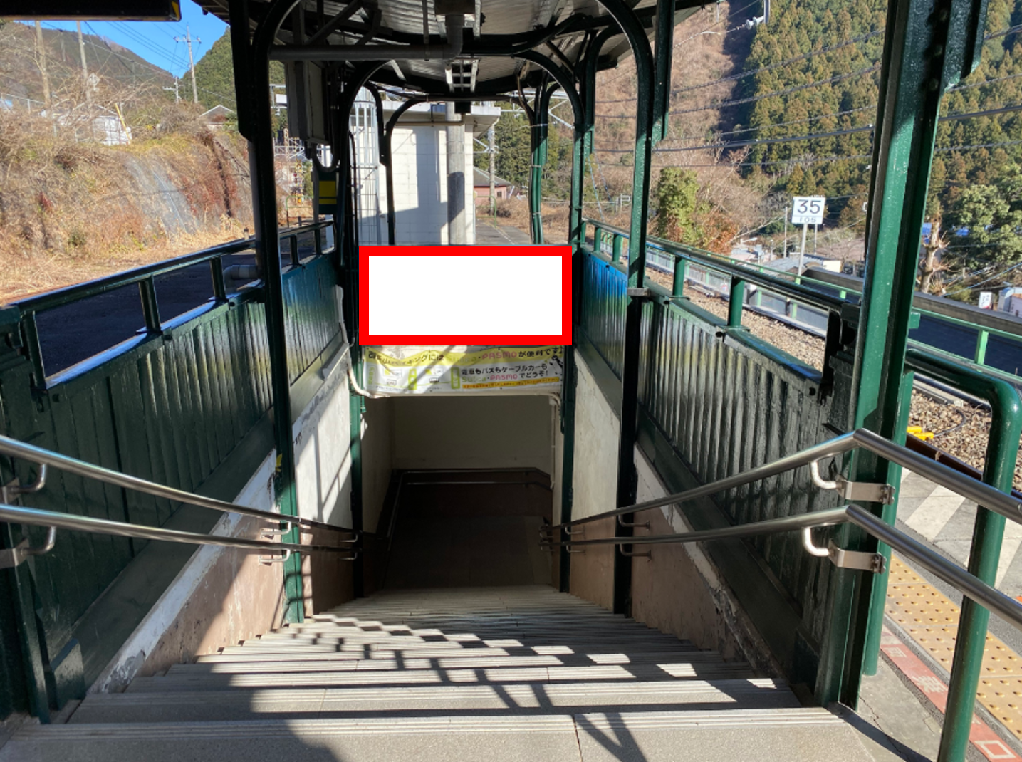 JR中央線・五日市線の御嶽駅、ホーム階段正面に設置された看板のご案内です。