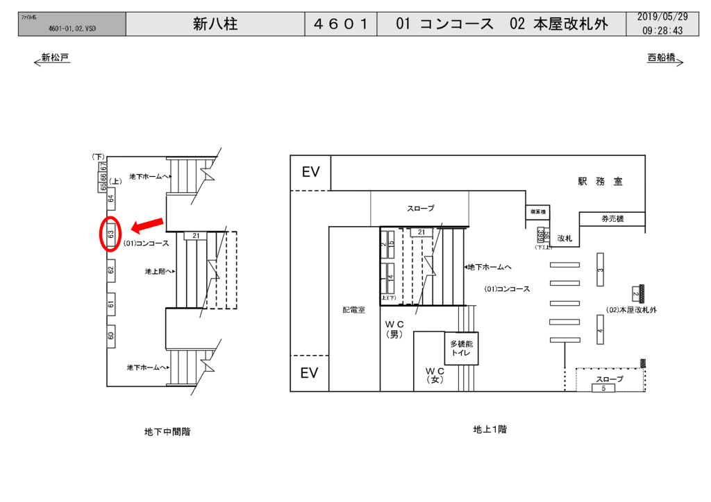 JR新八柱駅改札内、武蔵野線ホーム階段踊り場の西船橋・東京方面階段近くに設置されている看板です。