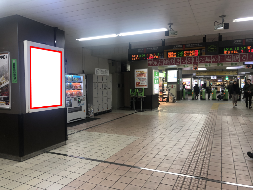 ■改札前の通路に面している柱面に設置されている視認性の高い看板です。