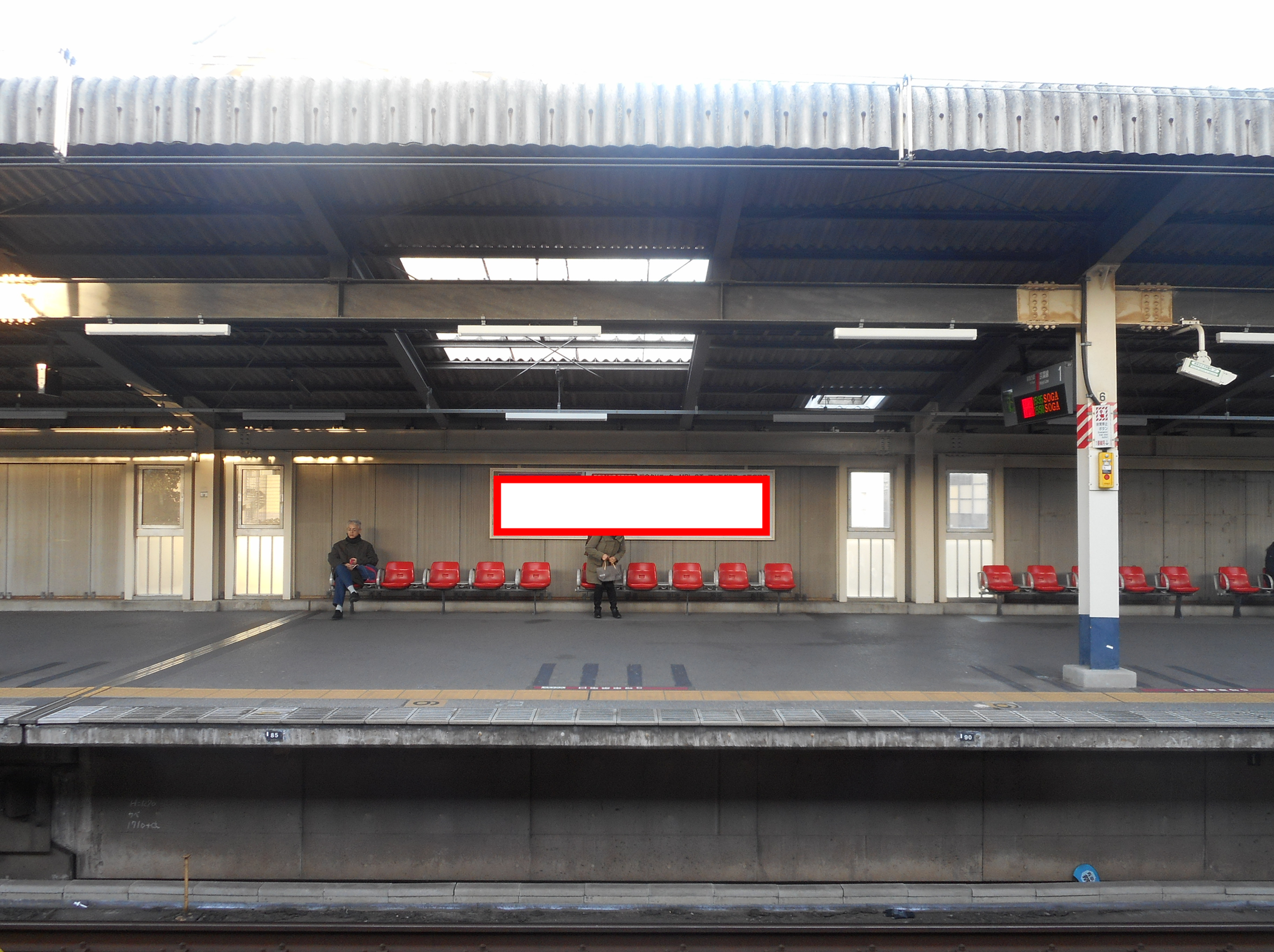 JR検見川浜駅の下りホームのベンチ背面に設置されている大型ボード看板です。