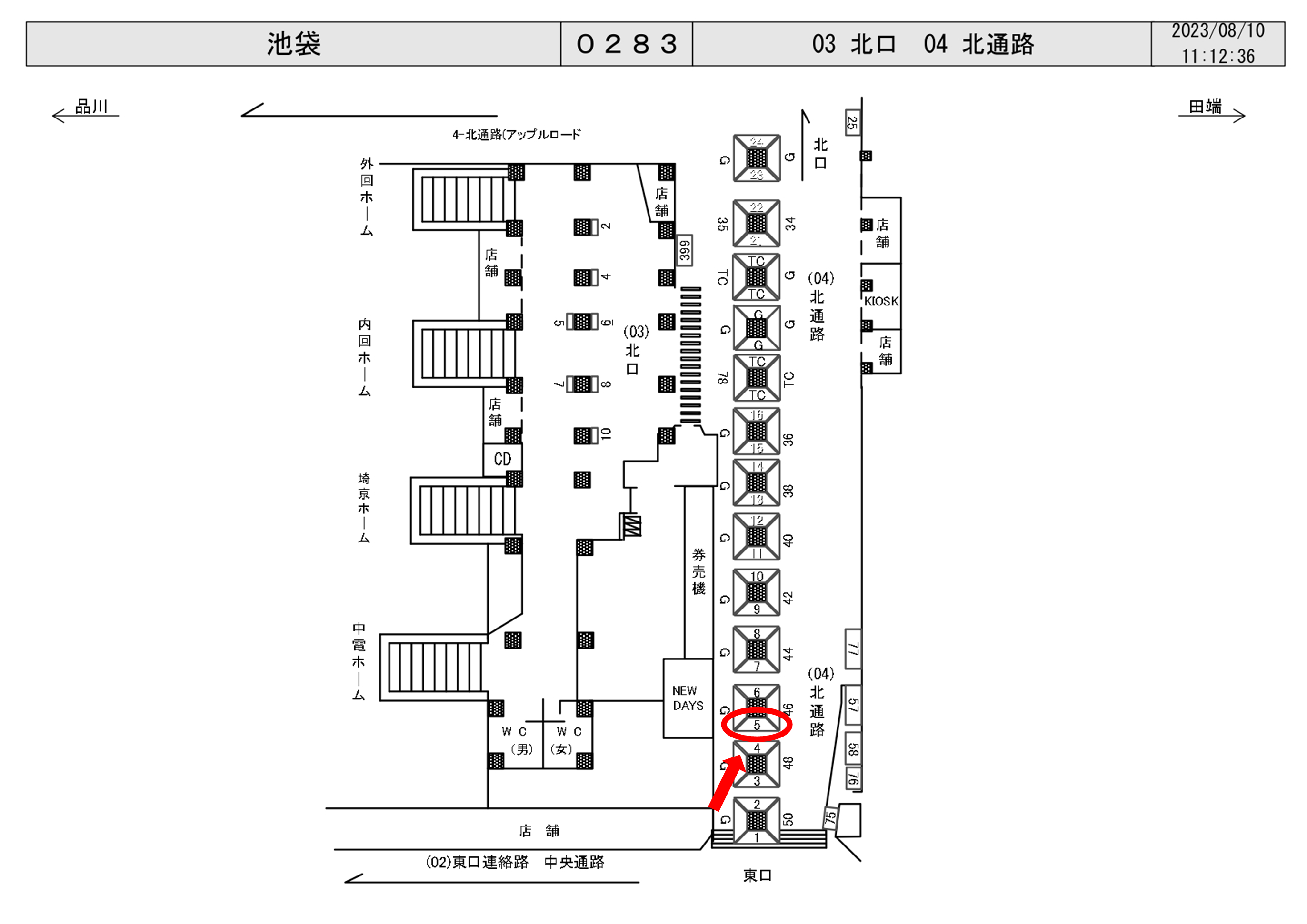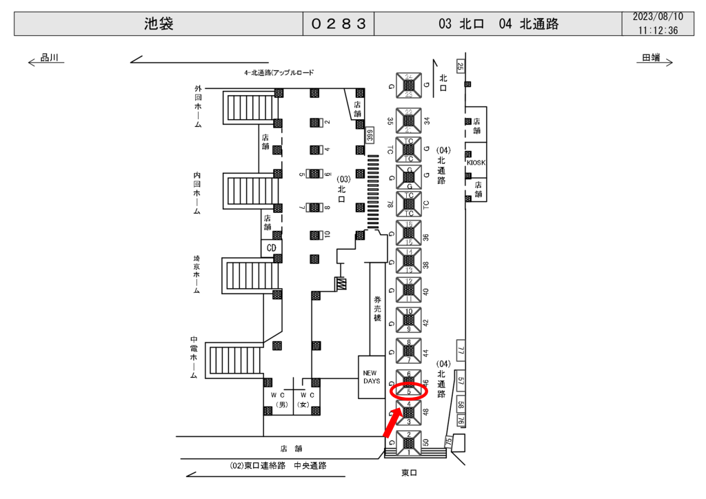 JR池袋駅の改札外、北通路のNew Days付近の東口寄り柱面に設置された駅看板です。