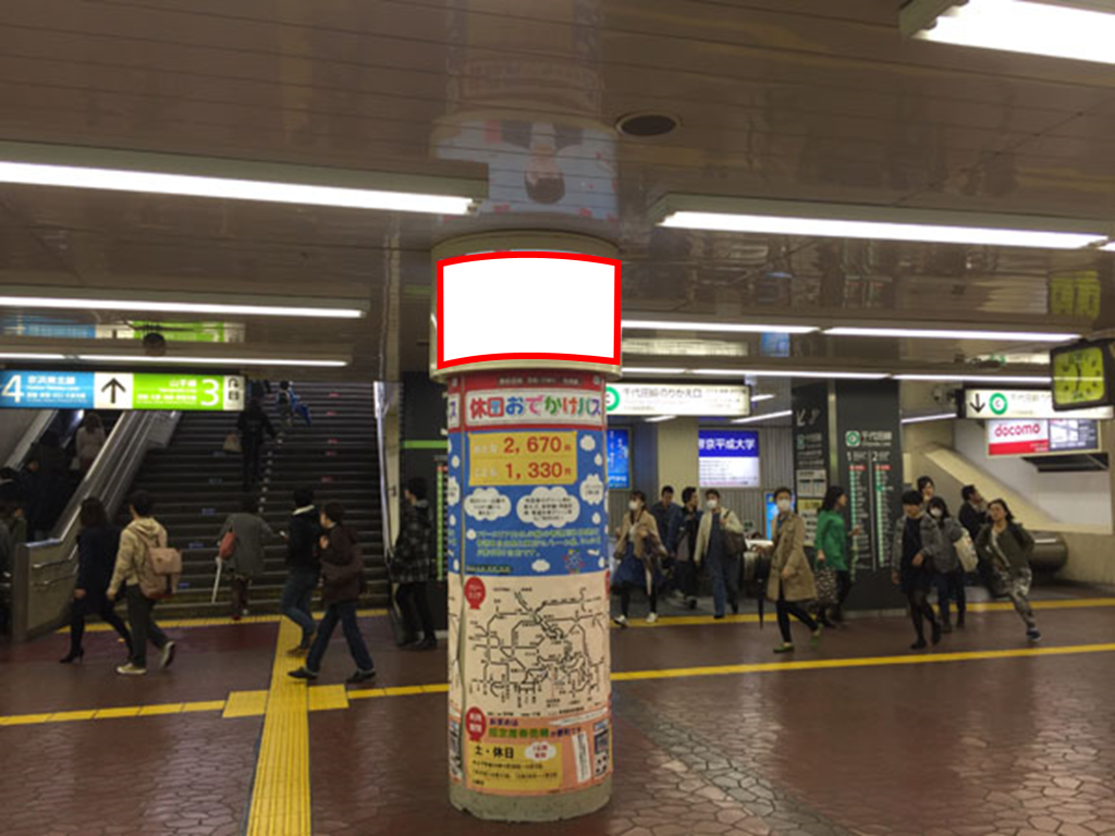 JR西日暮里駅のホーム階段踊り場にある柱の1周に設置された柱巻き看板です。