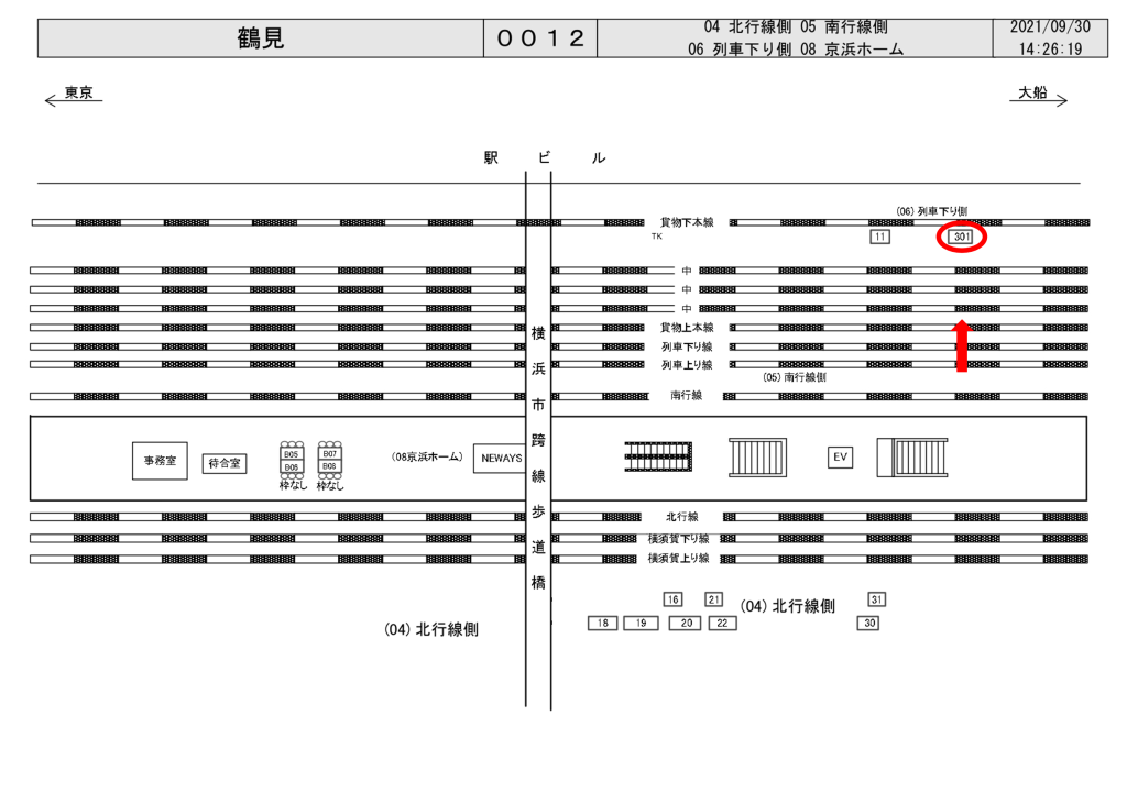 JR鶴見駅の京浜東北線(大船方面)ホーム前、ホーム階段付近に設置された上部照明付き大型ボード看板です。